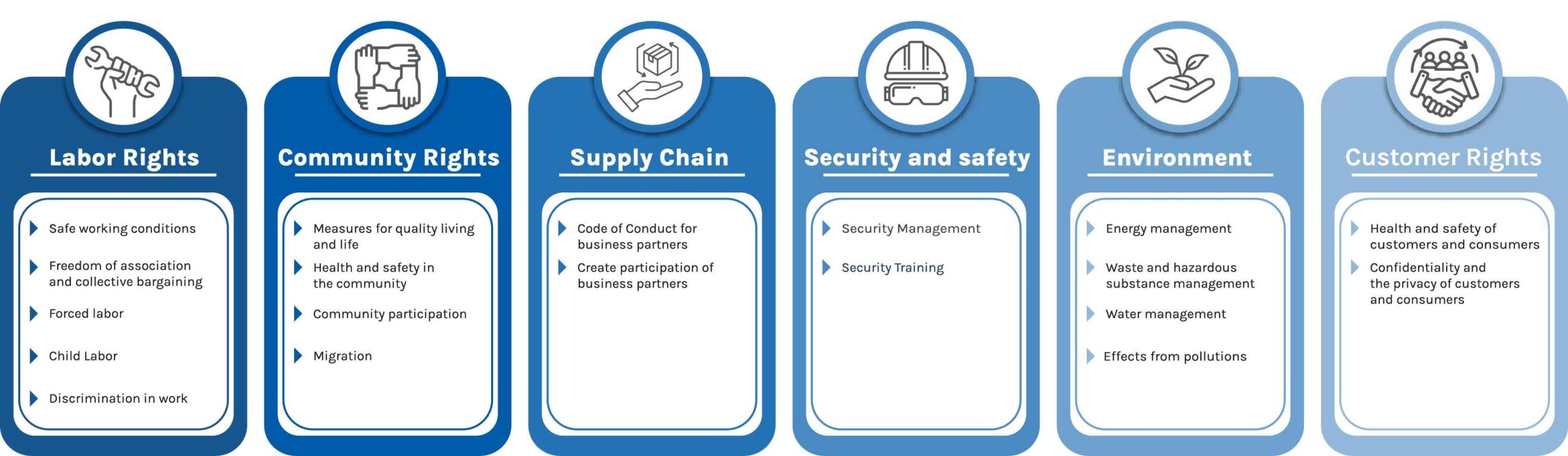 namely labor rights, community rights, supply chain, security and safety, environment and customer rights.