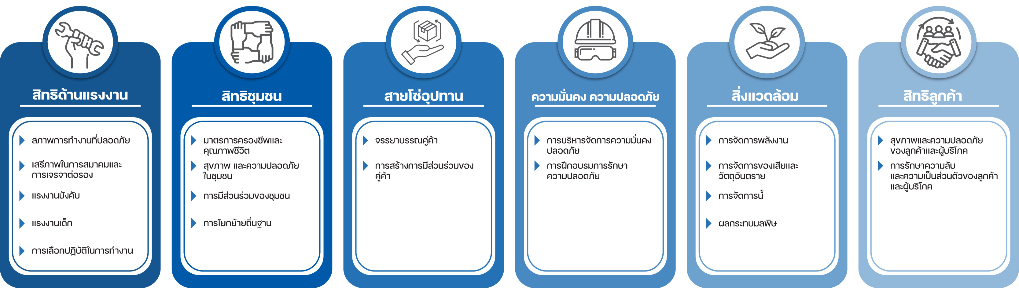 ได้แก่ สิทธิด้านแรงงาน สิทธิชุมชน ห่วงโซ่อุปทาน ความมั่นคงปลอดภัย สิ่งแวดล้อม และสิทธิผู้บริโภค